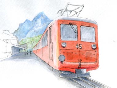 シャモニーからグランドジョラスを望むモンタンヴェール展望台まで20分で結ぶ登山鉄道。100年以上の歴史がある。