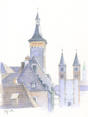 ドイツ、ロマンティック街道の起点、ヴュルツブルクです。 中央の時計塔は市庁舎、後方の聖キリアン大聖堂は12世紀ごろ創建の美しい建築ですが、残念ながら第二次大戦で失われ、戦後に再建されたそうです。