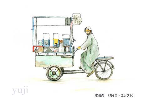 昔は水瓶をかついで売り歩く人がいたようだが、今はジュース売り?